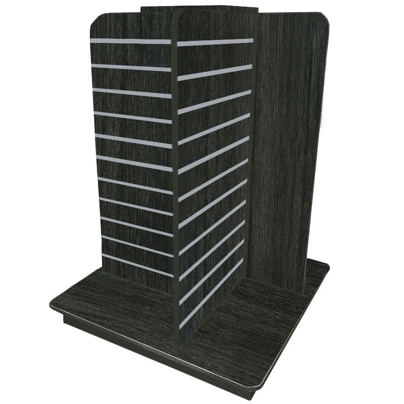 Super stylish 4-Way Slatwall Gondola Retail Display Unit in a Jet Oak finish, customisable with Slatwall accessories.