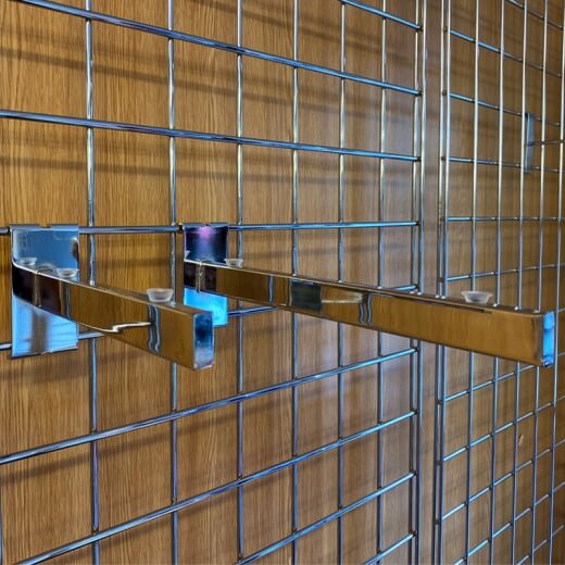 Chrome supports for your Gridwall® glass shelves available in depths of 200mm (8″), 250mm (10″), 300mm (12″) and 350mm (14″) to match our glass shelves, available separately (see additional products below).