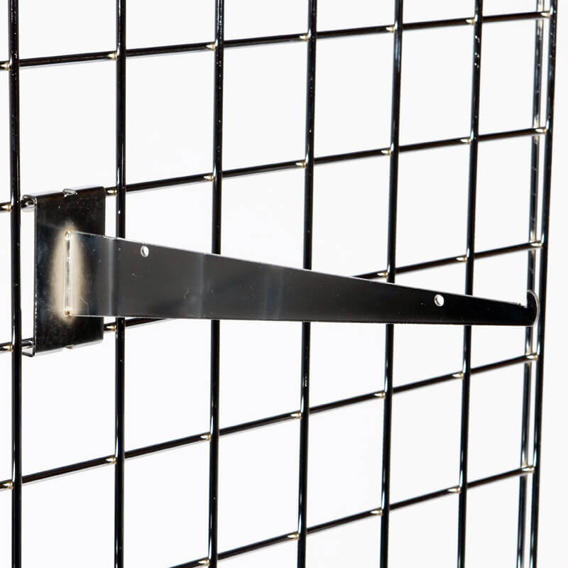 Chrome support brackets for Gridwall® MDF Shelves available in depths of 300mm (12″) to match our MDF shelves (available separately, see additional products below) and 350mm (14″) in case you prefer a little extra stand-off from the back panel.