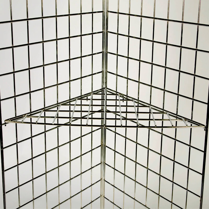 Super strong triangular corner shelf designed for Gridwall®, sized at a generous 610mm W x 610mm D (24″ x 24″) with superb load bearing capabilities ideal for supporting even quite heavy products.