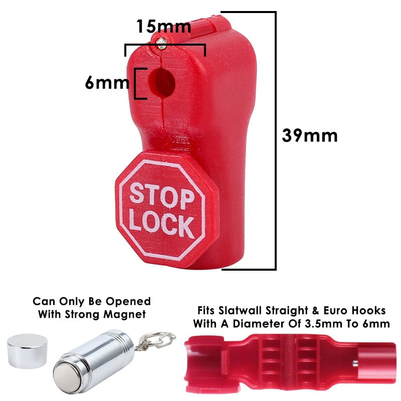 Made from durable plastic, the lock can only be removed with the magnetic key – (sold separately below). Stop Lock is printed in a vibrant red colour to notify customers that this item is security protected. Fits hooks with a diameter of 3.5mm to 6mm.