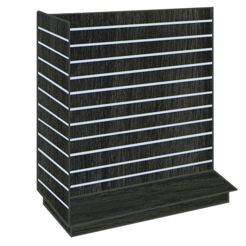 T-Shaped Slatwall Gondola Retail Display Unit in a Jet Oak finish, fully customisable with Slatwall accessories.