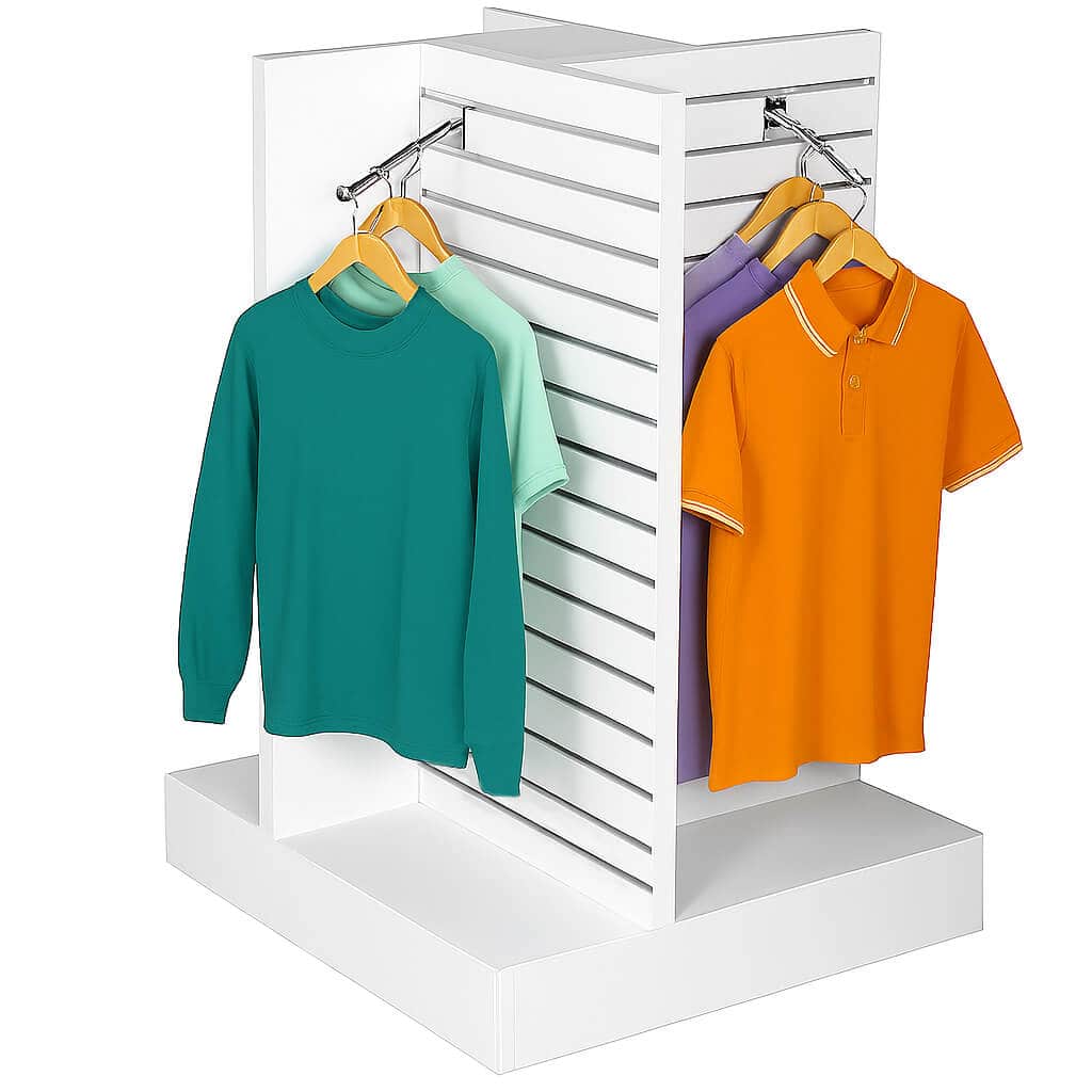 Incorporating four individual Slatwall panels angled at 90 degrees to each other and supplied with pre-fitted aluminium inserts. These gondolas are perfect for displaying co-ordinates and outfits where individual elements can be displayed, for example a jacket, waistcoat and trousers… and still room for ties, cuff links, belts and more!